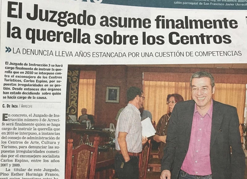 En ese año, el consejo de administración de los Centros Turísticos, que presidía la popular Ástrid Pérez, presentaba una querella criminal contra el entonces líder del PSOE lanzaroteño por presuntas ilegalidades cometidas por Carlos Espino en la gestión de los mismos entre 2007 y 2009. Espino era en esos años consejero delegado de los Centros, en la época de Manuela Armas como presidenta, apoyada por el PIL de Dimas Martín.