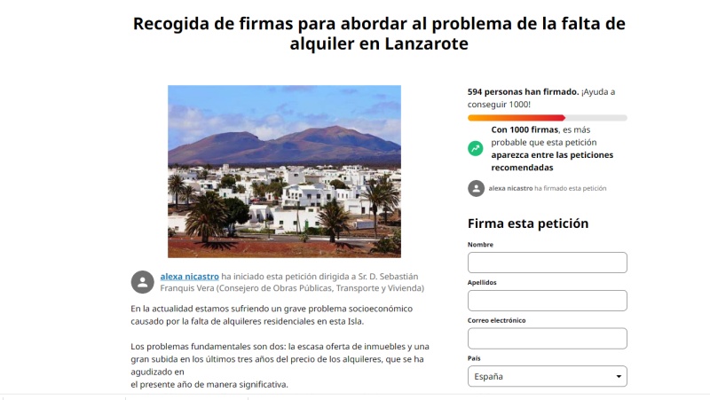 La falta de viviendas en Lanzarote se ha convertido en un problema de primer orden para la sociedad insular. Una vecina de la isla, Alexa Nicastro, ha iniciado una petición en Change.org dirigida a Sebastián Franquis Vera, consejero de Obras Públicas, Transporte y Vivienda, para tratar de buscar solución a este serio problema.