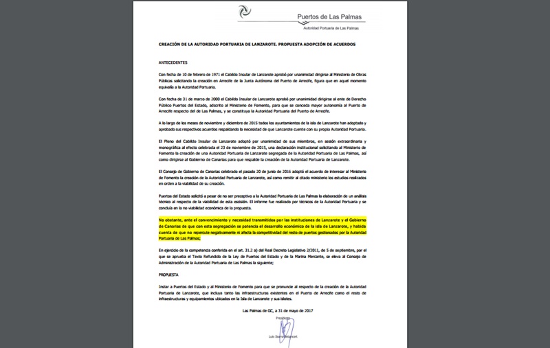 De igual forma, según se recoge en la propuesta aprobada por el Consejo de Administración, aunque el informe inicial elaborado por los técnicos de la Autoridad Portuaria concluía que la propuesta no era viable, en contraposición con los otros estudios e informes encargados por el Cabildo de Lanzarote y el Gobierno de Canarias que sentenciaban que "quedaba acreditado el interés público y la viabilidad económica y jurídica de una gestión autónoma en Lanzarote", con esta segregación "se beneficiará el desarrollo económico de Lanzarote sin repercutir negativamente ni afectar a la competitividad del resto de puertos de Canarias", tal y como sostenían también los citados informes del Gobierno y el Cabildo.