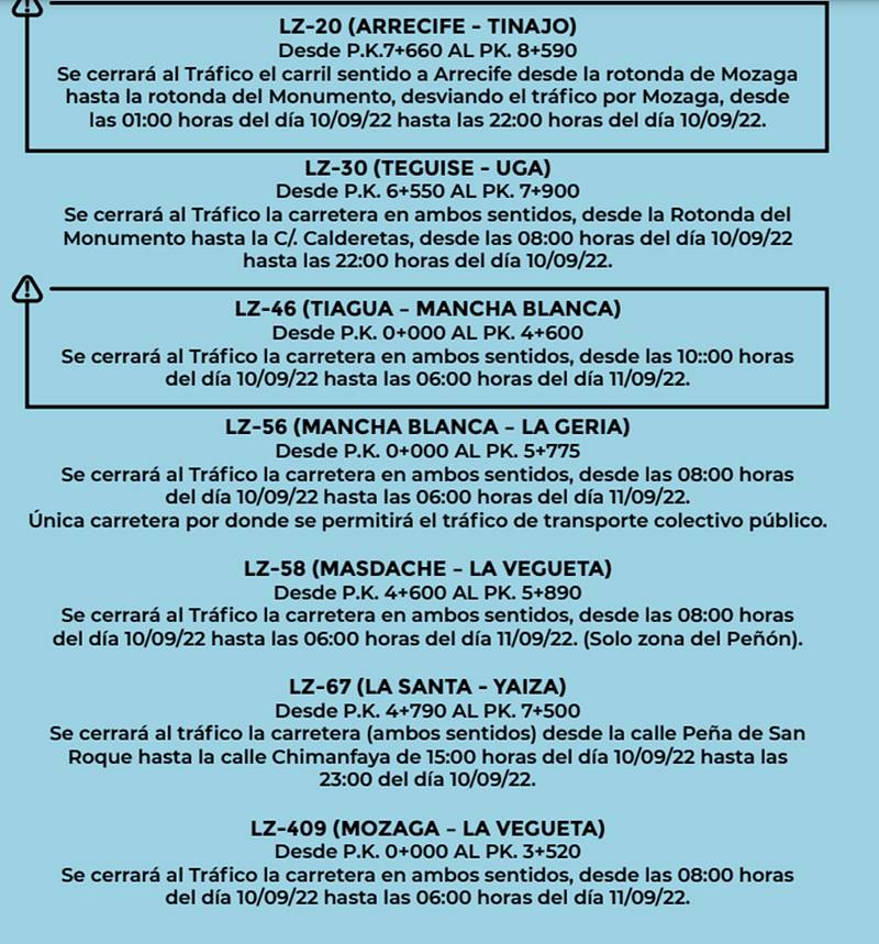 El Consorcio de Seguridad y Emergencias de Lanzarote, en colaboración con el Cabildo Insular y el Ayuntamiento de Tinajo han hecho pública la relación de los cortes de carretera para la celebración de la tradicional romería de Los Dolores este próximo día 10 de septiembre.