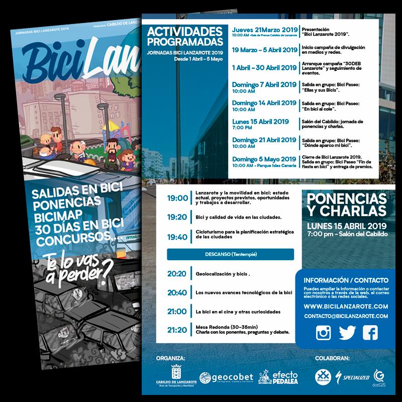 El programa de actividades ha sido desarrollado por el Área de Transportes y Movilidad del Cabildo de Lanzarote, área que dirige la consejera Patricia Pérez, junto a Geocobet y Efecto Pedalea y, entre otros, cuenta con la colaboración de la campaña estatal 30 Días en Bici, programa al que también se ha sumado Lanzarote a través de estas Jornadas BiciLanzarote2019 (ttp://30diasenbici.com/ciudades/lanzarote/).