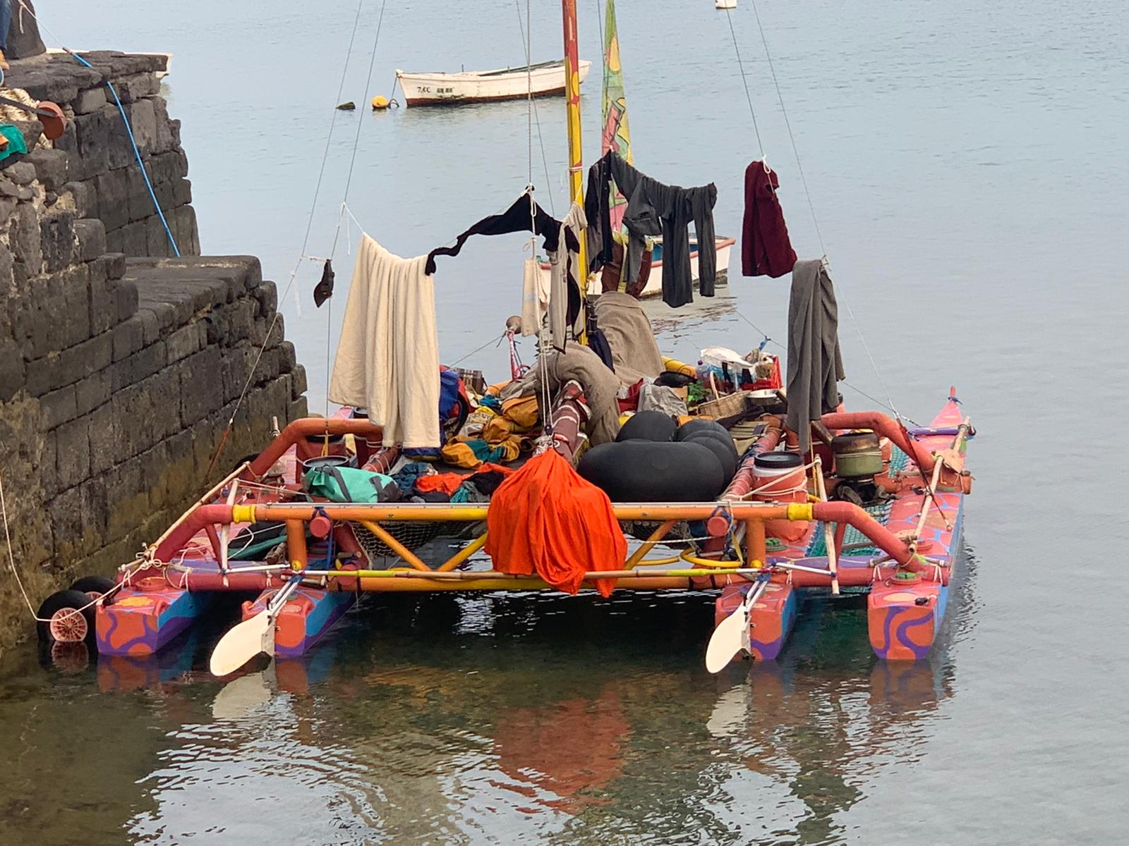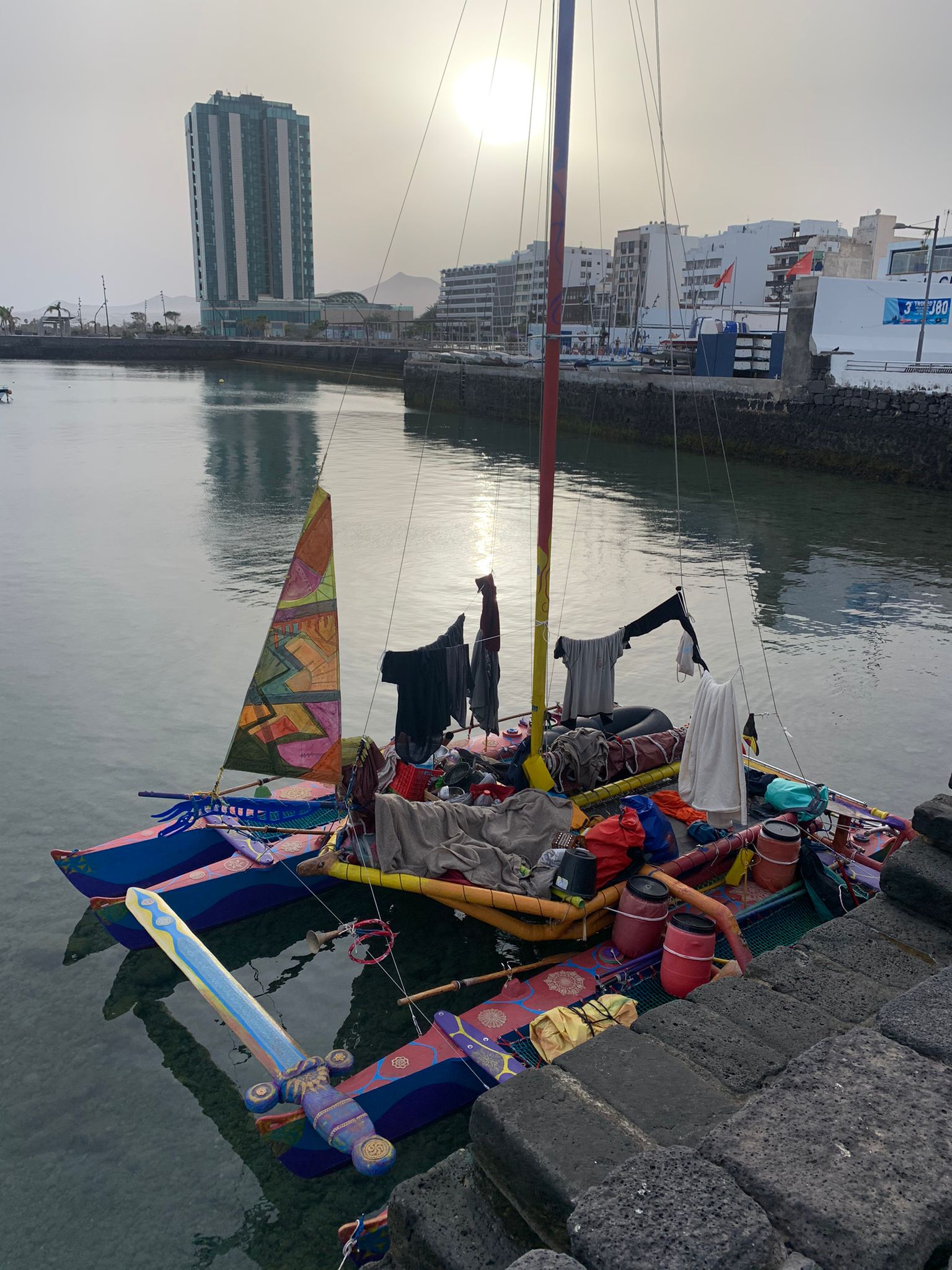 No estamos en los años Setenta, pero desde el pasado miércoles el Muelle de la Pescadería de Arrecife acoge a un visitante muy particular: un catamarán hippie y artesanal que, al parecer, ha venido viajando desde Francia y se ha convertido en un atractivo más de la marina de Lanzarote.