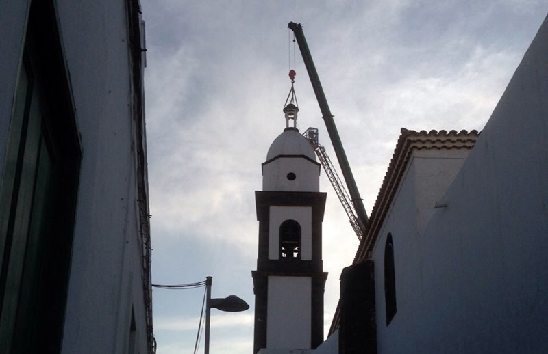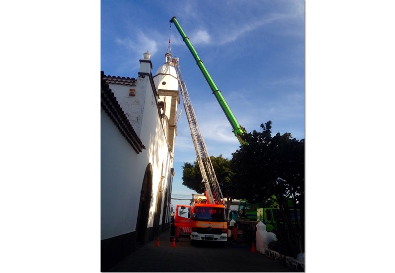 Bomberos del Consorcio de Seguridad y Emergencias, con ayuda de una grúa de Transportes Tiagua, procedían a subir al campanario, cortar la linterna y retirarla, en una complicada tarea que se extendió durante horas y que fue seguida de cerca por muchos viandantes.
