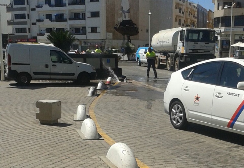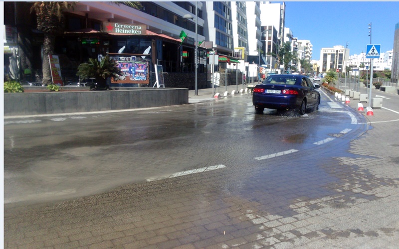 De agua se llenó este jueves la avenida marítima de Arrecife a la altura del Arrecife Gran Hotel con motivo de la rotura de una tubería durante los trabajos de renovación de la red que Canal Gestión lleva a cabo en la zona.