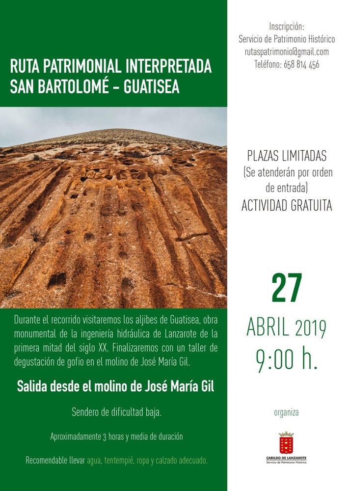 El Cabildo de Lanzarote, a través del Servicio de Patrimonio Histórico, que dirige la consejera Carmen Rosa Márquez, ha organizado para el próximo sábado, 27 de abril, una nueva ruta patrimonial interpretada por San Bartolomé y Guatisea.