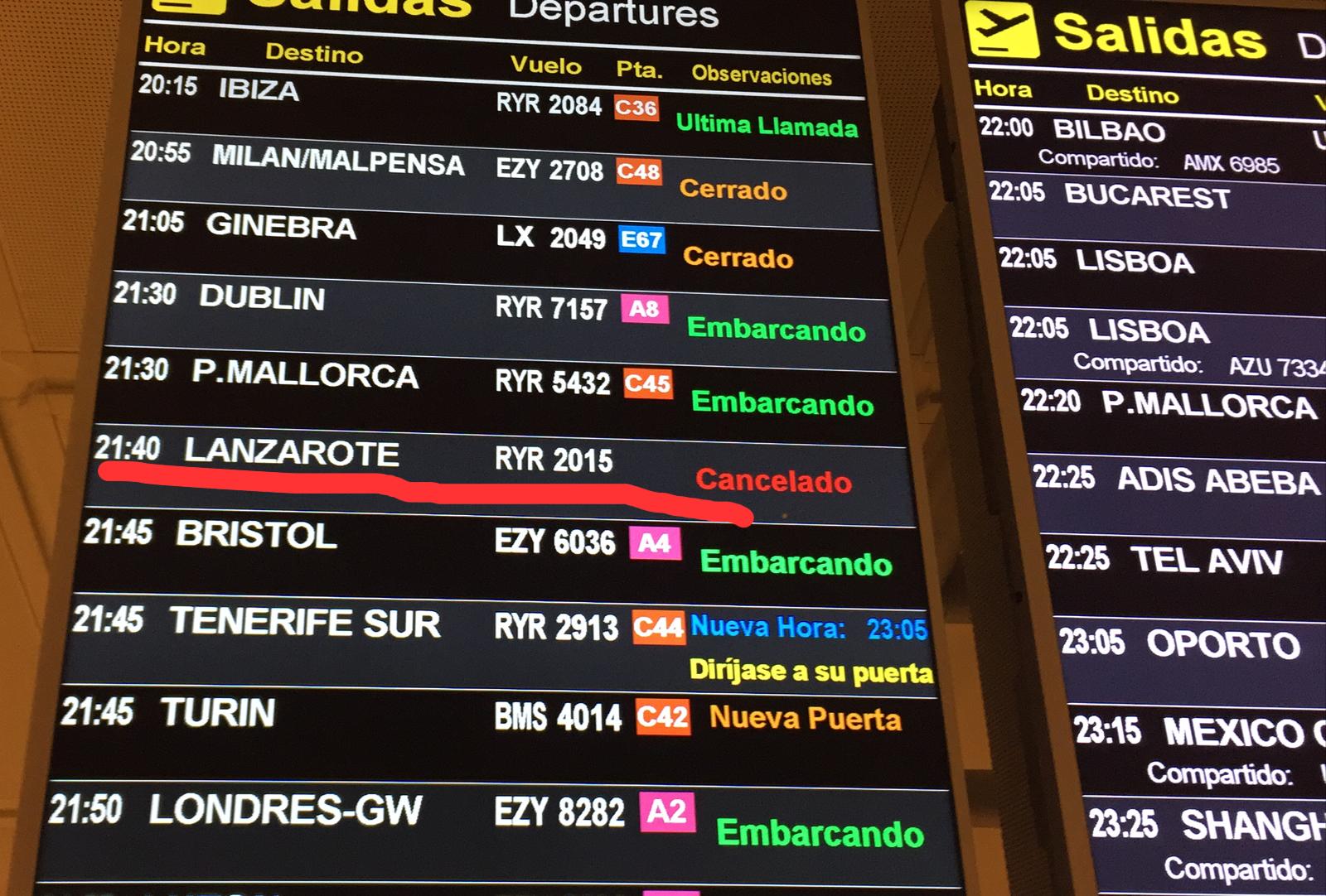 La compañía aérea Ryanair ha dejado 'botados' en Madrid a los pasajeros que tenían destino a Lanzarote este domingo en el vuelo de la noche, según informó la empresa a los afectados "por avería".