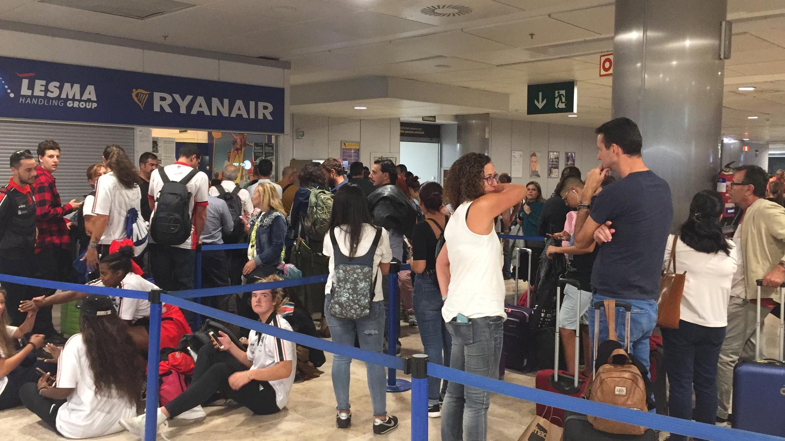 Entre los casi 200 pasajeros se encuentran las chicas del equipo profesional de baloncesto Magec Tías, que habían ido a jugar este fin de semana a Murcia, donde además de la victoria del partido que disputaron en la mañana del domingo, se han llevado un chasco al llegar al aeropuerto de Madrid.