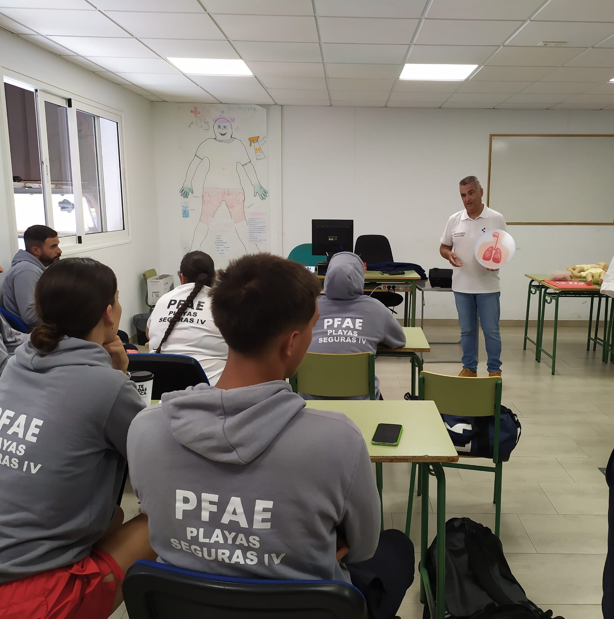 El instructor del Área de Salud de Lanzarote, Benjamín Nieves Delgado imparte estos días un taller sobre técnicas de soporte vital básico a los alumnos del programa de formación y empleo PFAE Playas Seguras.