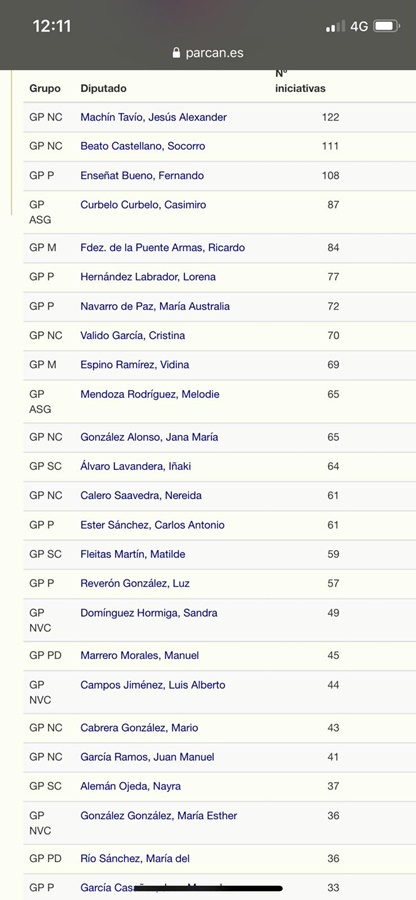 Hoy, recién estrenado el año y con 122 iniciativas registradas, muy por encima del resto, se ha convertido en el parlamentario canario más activo desde que se iniciara esta X Legislatura. (https://parcan.es/composicion/diputado_iniciativas.py?ID_MIEMBRO=10027#PE)
