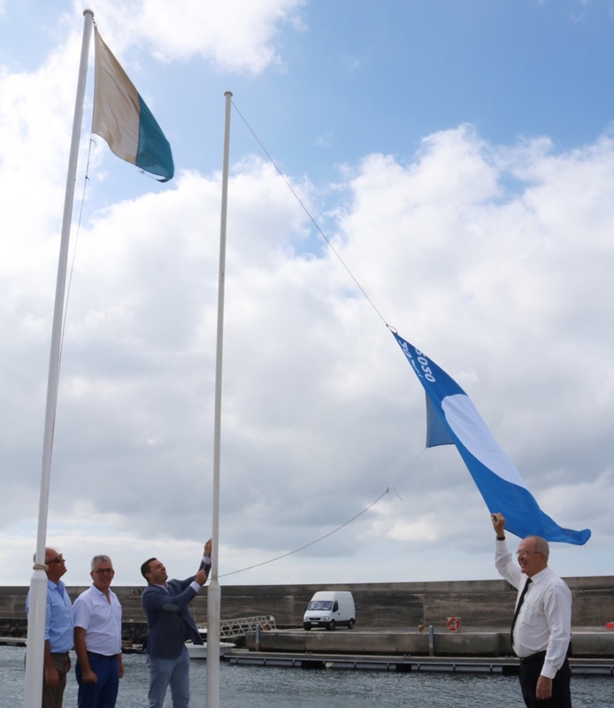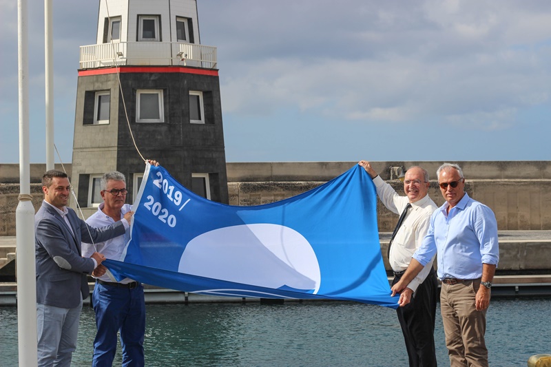 El alcalde de Yaiza, Óscar Noda, y el presidente de Calero Marinas, José Calero Rodríguez, izaron este martes junto a Ángel Domínguez, primer teniente de alcalde y concejal de Turismo sureño, y Constante Lorenzo, director de Operaciones de la marina, la Bandera Azul 2019–2020 otorgada a Puerto Calero por la Asociación de Educación Ambiental y del Consumidor (ADEAC).