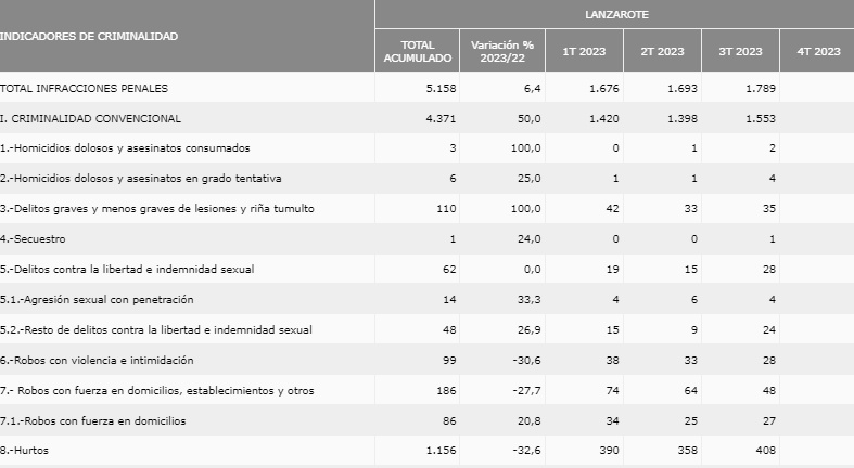 Según este estudio, la criminalidad convencional en Lanzarote ha subido un 50 %, mientras que en Arrecife se logra bajar en un -0,5 %. En Teguise, segundo municipio más poblado, la tasa ha subido un 14,5 % y en Tías un 8,5.