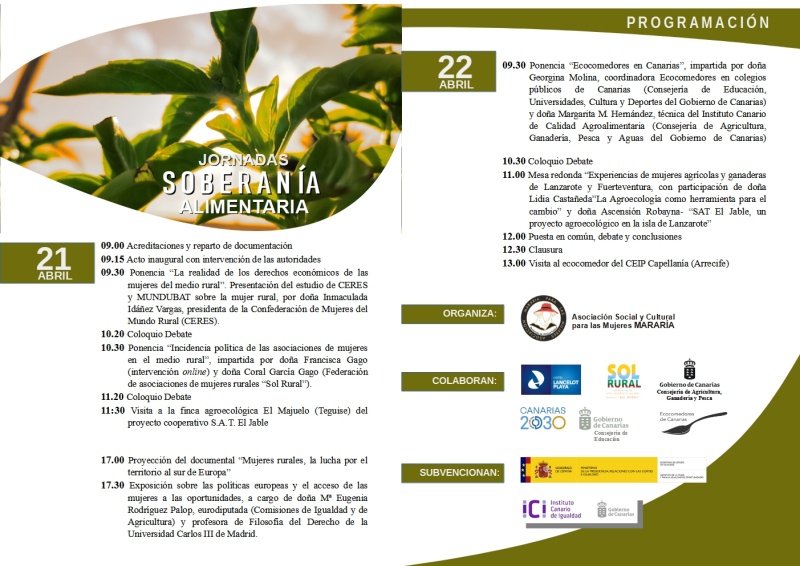 La asociación social y cultural para las Mujeres, Mararía, ha convocado las jornadas formativas y de reflexión "De la tierra a la mesa: la soberanía alimentaria en el nuevo paradigma de la sostenibilidad", que se celebrarán en el hotel Lancelot de Arrecife los días 21 y 22 de abril.