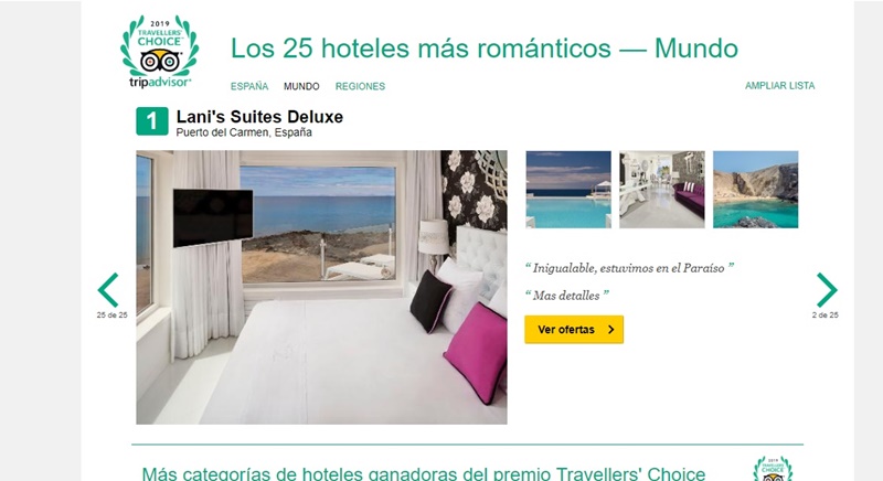 El hotel Lani's Suites de Luxe, de Puerto del Carmen (Lanzarote), que ya había sido galardonado, en ediciones anteriores, como el hotel más romántico de toda España en los premios anuales que concede la web TripAdvisor, a partir de las opiniones de sus usuarios, ha sido premiado este año como el “más romántico del mundo 2019” según la misma web, así como en las categorías Atención al cliente, en segundo puesto y Hotel pequeño, en cuarto puesto.