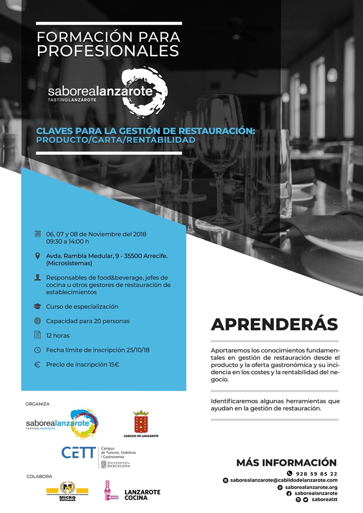El Cabildo de Lanzarote, a través del Área de Promoción Económica que dirige el consejero Ángel Vázquez (PP), y Saborea Lanzarote organizan el curso denominado 'Claves para la gestión de la restauración: producto, carta, rentabilidad', homologado por la Universidad de Barcelona y orientado a jefes de cocina, responsables de food&beverage y otros gestores de restauración.