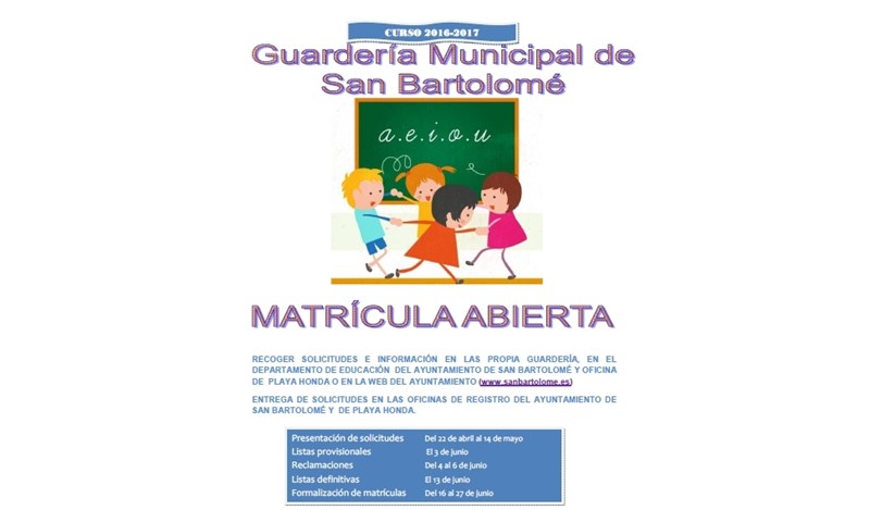 A partir del miércoles día 22 de abril y hasta el 14 de mayo, estará abierto el plazo de presentación de solicitudes de matrícula en las Guarderías Municipales de San Bartolomé y Playa Honda para el curso entrante 2016-2017. Así, se informa desde el Ayuntamiento indicando además que las solicitudes deberán recogerse en las Guarderías Municipales, en el departamento de Educación del Ayuntamiento de San Bartolomé, en las Oficinas Municipales de Playa Honda o en la página web del Ayuntamiento www.sanbartolome.es. Asimismo, se hará entrega de solicitudes en las oficinas de Registro del Ayuntamiento de San Bartolomé o de Playa Honda.