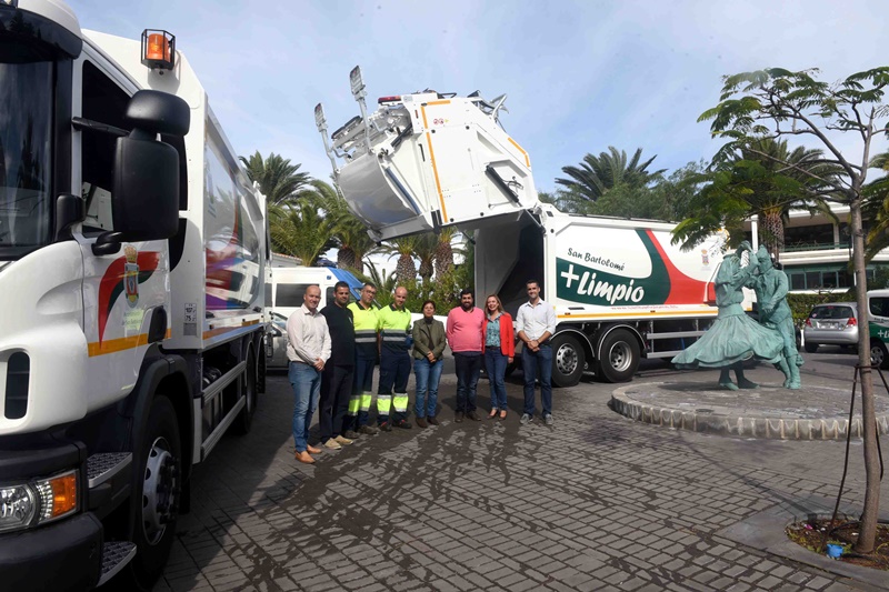 En la mañana de este miércoles se presentaron los dos nuevos camiones de recogida de basura y el nuevo vehículo de servicios público, que prestarán sus servicios en el municipio de San Bartolomé a partir de este momento. A ellos se suman 150 contenedores de basura, “que se van colocando progresivamente según deterioro de los existentes o colocándose en nuevos puntos según necesidades del servicio”.