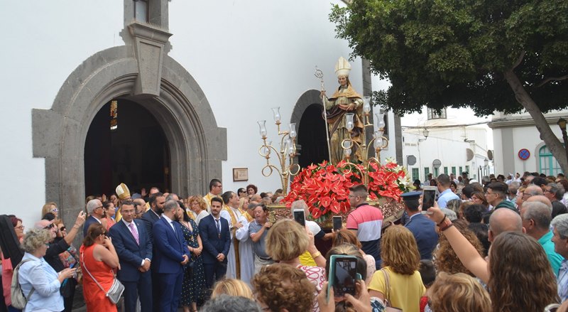 Tras la eucaristía, la imagen del santo patrón salió en procesión y recorrió las calles aledañas de la plaza de Las Palmas y llegó hasta el linde (zona actual del instituto Agustín Espinosa), límites hasta donde llegó el primitivo puerto del Arrecife. En ese lugar- que identificara las afueras de la ciudad se localizó el primer cementerio de Arrecife (actual parcela del IES Agustín Espinosa). La procesión, escoltada por la banda municipal y las autoridades civiles y militares, discurrió por la actual avenida y paseo de La Marina, para seguir por la zona del Parque José Ramírez Cerdá, la Boca del Muelle, el Puente de Las Bolas y la Calle Manuel Miranda, que fuera cura de San Ginés, y que rodea el actual edificio del Ayuntamiento de Arrecife, antigua recova municipal.