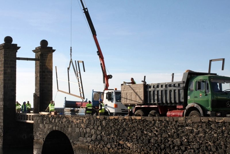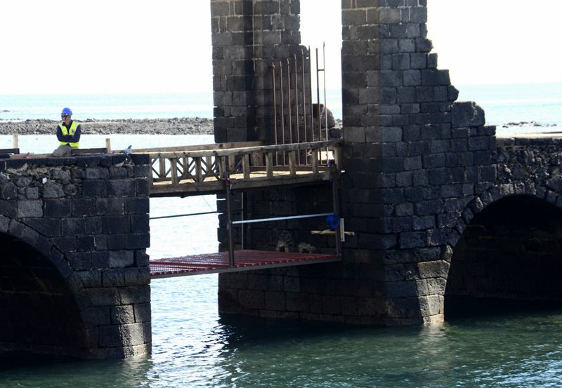 Según los responsables de Vías y Obras del Ayuntamiento de Arrecife, la colocación del andamiaje finalizará en la jornada de hoy, por lo que mañana se abrirá el paso con normalidad a peatones y embarcaciones.
