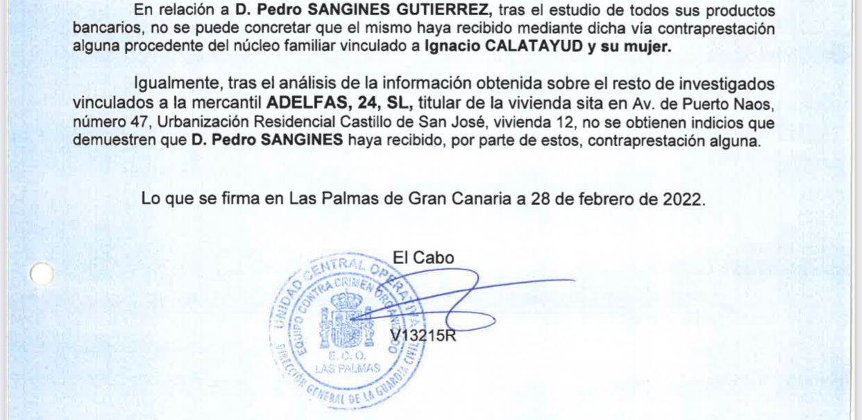 -“Igualmente, tras el análisis de la información obtenida sobre el resto de investigados vinculados a la mercantil Adelfas, 24, SL (propietaria de la vivienda adquirida), no se obtienen indicios que demuestren que Pedro San Ginés haya recibido, por parte de estos, contraprestación alguna”.