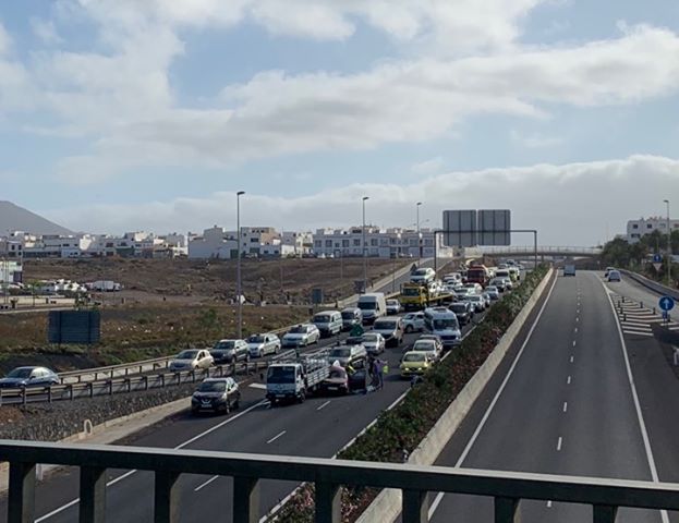 Las retenciones por el accidente múltiple de Playa Honda, provocó que las colas de los coches llegaran hasta la altura de los cuarteles de Arrecife, y probablemente un frenazo o un despiste provocó la colisión.