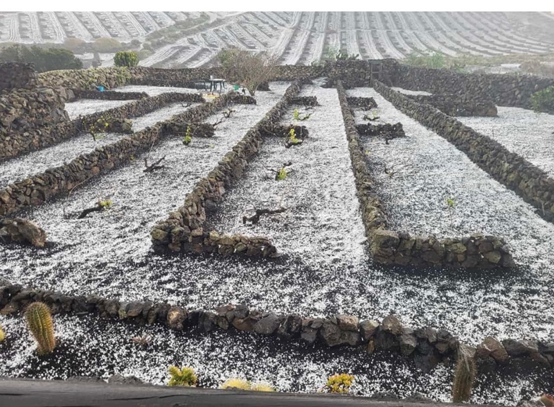Lanzarote está viviendo probablemente la que es la mayor granizada de los últimos 50 años, afectando prácticamente a toda la vertiente centro-norte, con puntos de mayor intensidad en Tinajo, Masdache, Teguise, Los Valles, Timanfaya y parte del municipio de Haría.