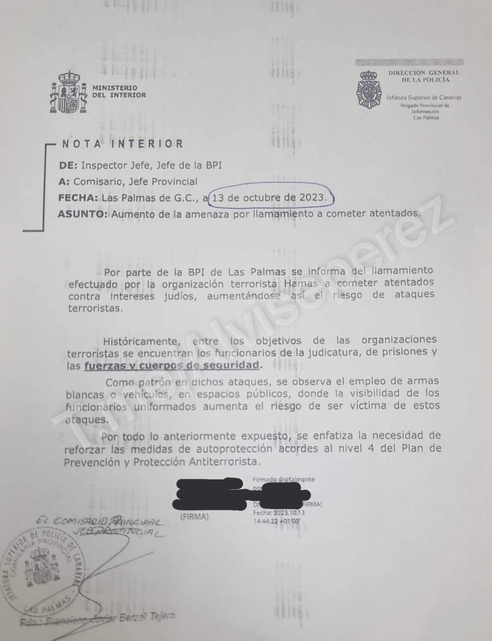 En un documento oficial de uno de los cuerpos y fuerzas de seguridad del estado dependientes del ministerio del Interior, firmado el pasado 13 de octubre, se llamaba a la necesidad de reforzar las medidas de autoprotección, sobre todo de los propios agentes, ante el nivel 4 del Plan de Prevención y Protección Terrorista, que tras el conflicto iniciado por Hamás y la respuesta de Israel, ha hecho saltar la señal de alarma ante un repunte de ataques terroristas.