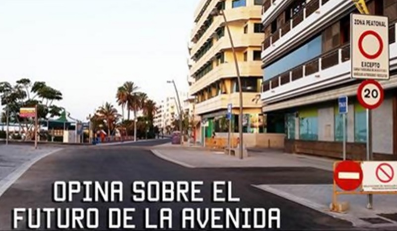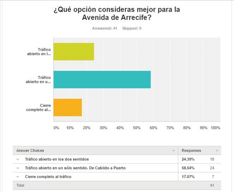 En la encuesta, apoyada entre otros por la Cámara de Comercio, se pregunta a los vecinos sobre qué opción consideran mejor para la avenida, si abrirla al tráfico en dos sentidos, hacerlo sólo en uno dirección Cabildo-Puerto de Los Mármoles o, por contra, que se cierre completamente al tráfico. A una hora de su publicación, de los 41 ciudadanos que habían votado, el 58,54% lo habían hecho a favor de que se abra en un sentido, el 24,39% a que se haga en los dos, y el 17,07% apostaba por su cierre.