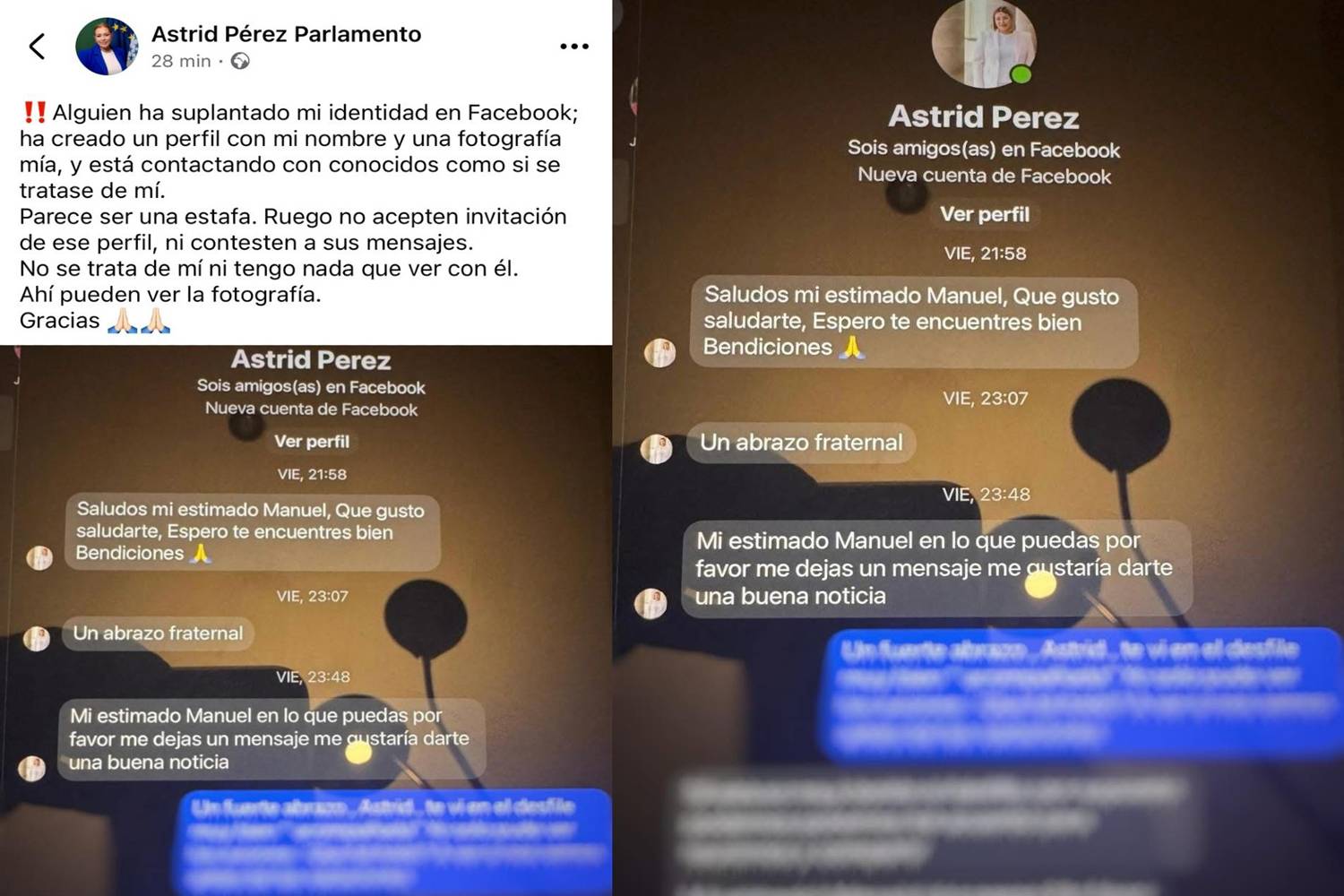 La presidenta del Parlamento de Canarias y parlamentaria por Lanzarote, Astrid Pérez, ha denunciado públicamente este sábado un intento de suplantación de identidad a través de la red social Facebook. Según ha explicado desde su perfil oficial, alguien ha creado una cuenta falsa utilizando su nombre y fotografía, contactando a personas conocidas como si se tratara realmente de ella.