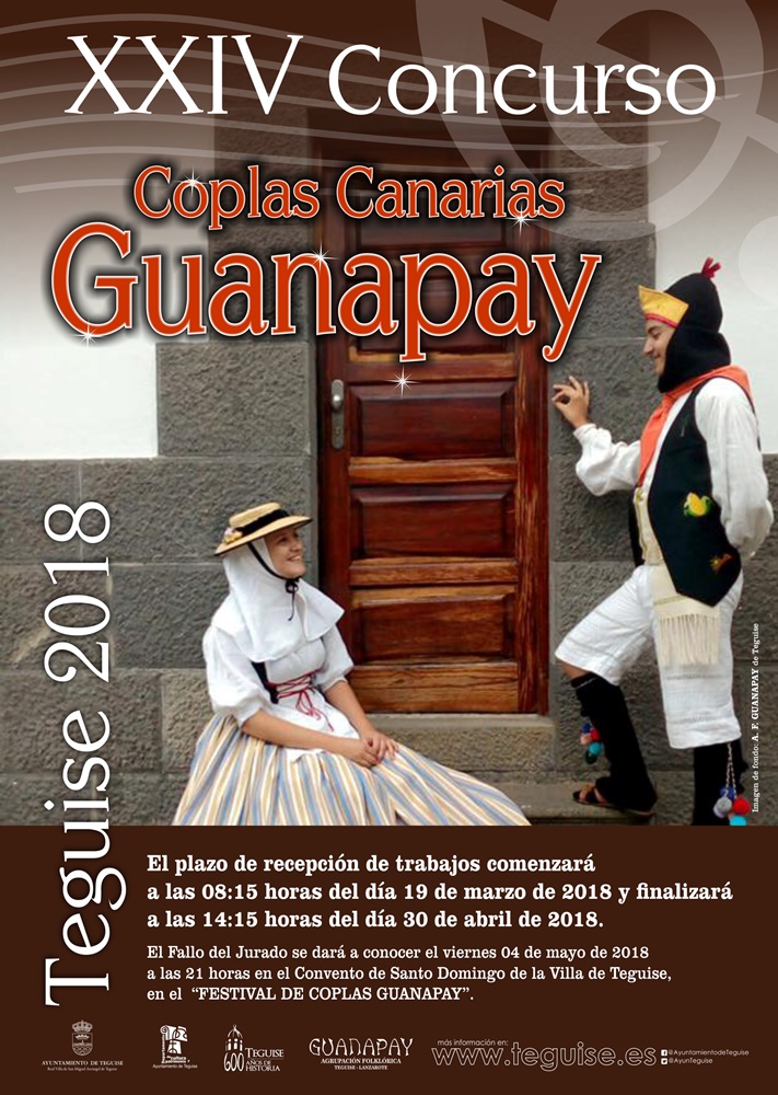 El Ayuntamiento de Teguise convoca tras 24 años seguidos el Concurso de Coplas Canarias Guanapay, impulsado por la agrupación folclórica del mismo nombre de La Villa. La recepción de los trabajos comenzó el 19 de marzo y concluye el 30 de abril.