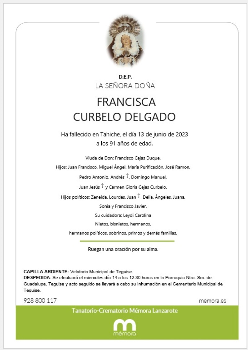 Teguise despedía este martes a Francisca Curbelo Delgado, viuda de Francisco Cejas Duque y madre del consejero de CC, Domingo Cejas, una mujer muy querida entre sus vecinos y todo un ejemplo de tesón y valentía.