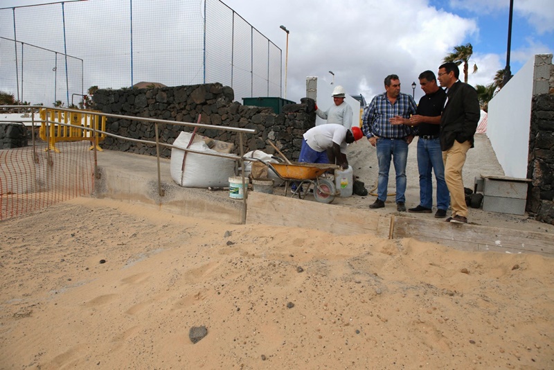 El alcalde de Teguise, Oswaldo Betancort, y el concejal del área, Eugenio Robayna, visitaron las obras en ejecución, entre ellas, la de la rampa de acceso a esta zona de baño, con la que se pretende mejorar la accesibilidad. "Tras el dragado y limpieza de La Charca, estamos mejorando la accesibilidad a la misma, así como reforzando los muros de contención", explicó el alcalde durante su visita, en la que consideró que con estas actuaciones se está dando respuesta a las demandas de los vecinos de Los Cocoteros y adelantó que "las intervenciones de mejora continuarán en la cancha multiusos, así como en los jardines y parque infantil".