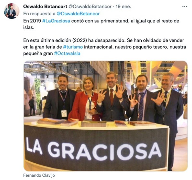 "LaGraciosa, la nueva San Borondón, aparece y desaparece de Canarias en @fitur_madrid según quién gobierne. ¿Dónde está el stand de #LaOctavaIsla?", escribía Betancort, añadiendo a continuación un nuevo tuit en el que aparece una foto de 2019, año en que la isla de La Graciosa contó con su primer stand, al igual que el resto de islas.