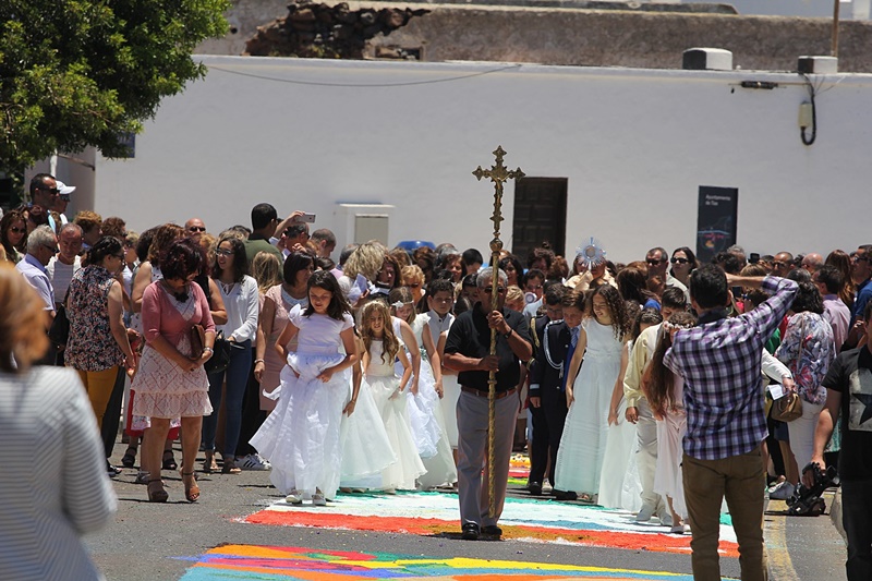 Numerosos vecinos del municipio, así como el alcalde de Tías, Pancho Hernández junto a otros miembros de la Corporación, asistieron a la función religiosa y a la posterior procesión que tuvo como protagonistas a los niños y niñas del municipio que este año han realizado su Primera Comunión y que, como manda la tradición, pisaron las coloridas y vistosas alfombras de sal.