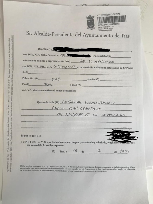 El concejal de Deportes y Fiestas de Tías, Francisco Javier Aparicio Betancort, ha aportado a los medios informativos una copia del registro de solicitud y entrada del " Anexo Plan de Seguridad XVI Rally Sprint La Candelaria ".