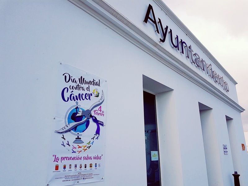 El Ayuntamiento de Tías se ha unido a las iniciativas de sensibilización en este domingo, 4 de febrero, Día Mundial contra el Cáncer. La fachada del Consistorio exhibe en este fin de semana la pancarta de sensibilización que AFOL, la Asociación de Enfermos Oncohematológicos de Lanzarote, ha creado para esta jornada.
