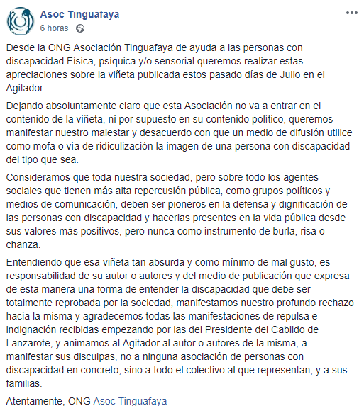 "Expresa de esta manera una forma de entender la discapacidad que debe ser totalmente reprobada por la sociedad, manifestamos nuestro profundo rechazo hacia la misma y agradecemos todas las manifestaciones de repulsa e indignación recibidas empezando por las del Presidente del Cabildo de Lanzarote, y animamos al Agitador al autor o autores de la misma, a manifestar sus disculpas, no a ninguna asociación de personas con discapacidad en concreto, sino a todo el colectivo al que representan, y a sus familias".