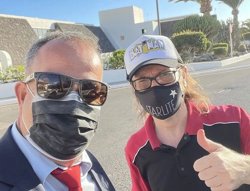 En la fotografía aparece junto a Conrado Hernández, chófer de Lanzarote Limusinas, empresa de Natalio Cruz.