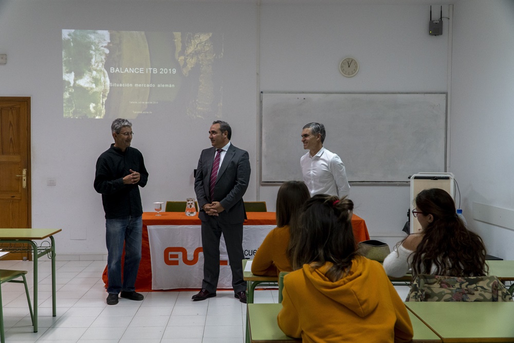 El consejero de Promoción Turística del Cabildo de Lanzarote y a su vez presidente del Consejo de Administración de la Sociedad de Promoción Exterior de Lanzarote (SPEL), Ángel Vázquez, y el consejero delegado del citado Ente insular de promoción, Héctor Fernández, mantuvieron el pasado viernes un encuentro con alumnos de la Escuela Universitaria de Turismo de Lanzarote (EUTL) con el fin de analizar la situación del mercado turístico alemán.