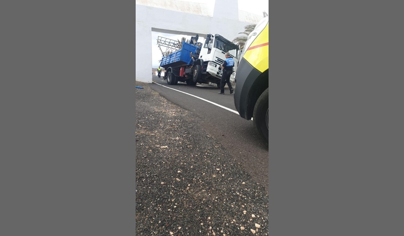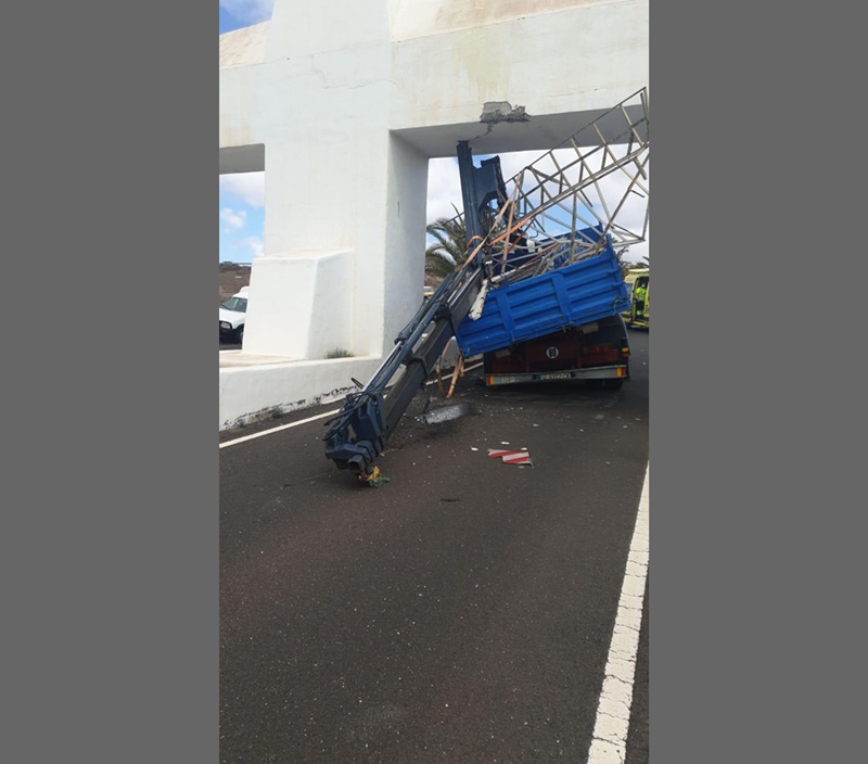 Un camión grúa chocaba en la mañana del lunes contra el portón de entrada a la localidad de Costa Teguise, a la altura de la rotonda.