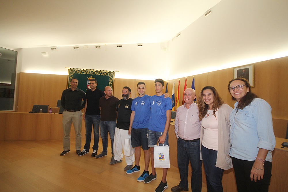 El alcalde de Tías, Pancho Hernández, acompañado por el teniente de alcalde y concejal de Turismo, Amado Jesús Vizcaíno, la teniente de alcalde y portavoz del PP en Tías, Saray Rodríguez, el concejal de Deportes, Francisco Javier Aparicio Betancort, el concejal de Economía y Hacienda, Ramón Melián, y la concejal del Área de Bienestar Social y la Familia, Aroa Pérez, ofrecieron a estos dos jóvenes jóvenes karatekas una recepción oficial antes de su partida a la final. Ahora han regreso a Lanzarote con su nuevos trofeos que lo acreditan entre los mejores katekas de España.