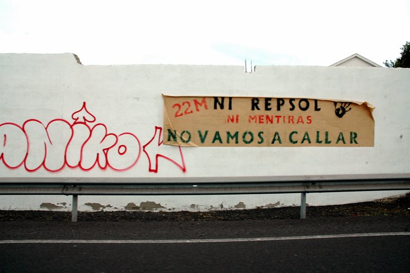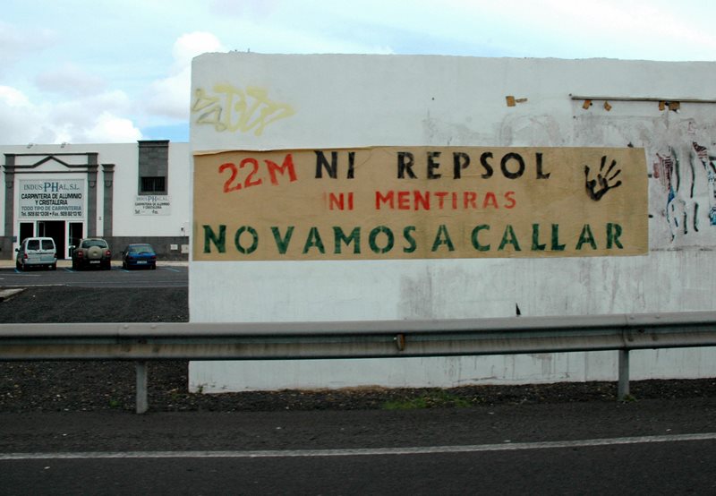 A pesar de que hace ya un mes que se celebró la manifestación contra el petróleo en Arrecife, todavía hay carteles pegados llamando a la movilización en algunos puntos de la isla, según ha comprobado Lancelot Digital.