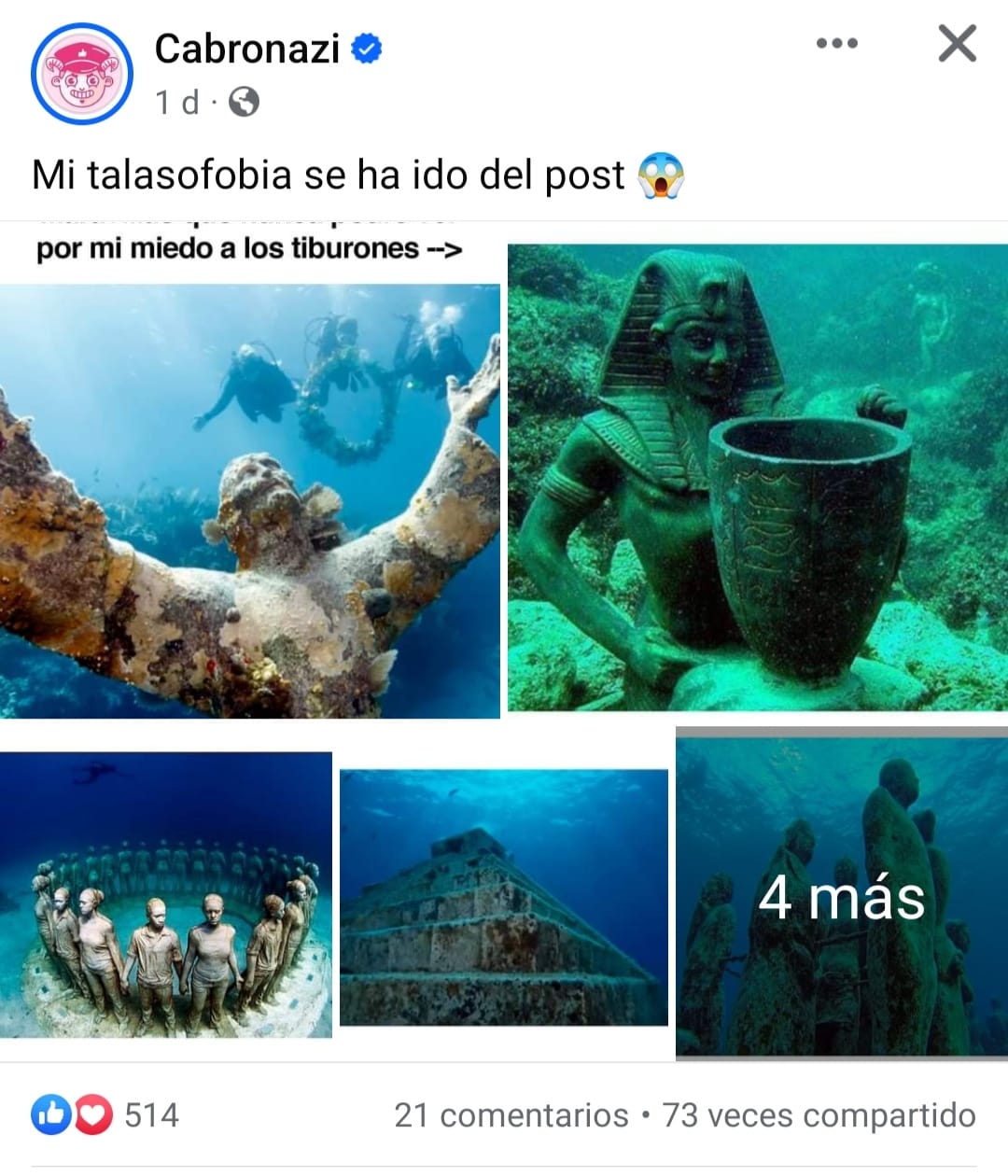 Este post que ha destacado por sus publicaciones irónicas, satíricas o curiosas, relata lo que uno se puede llegar a perder si tiene fobia al mar o las profundidades. Por ello destacada varias fotos de diferentes puntos del planeta y entre ellas han elegido varias del museo submarino ubicado en el sur de Lanzarote -lo que demuestra la exclusividad de esta iniciativa cultural y de recreo-.
