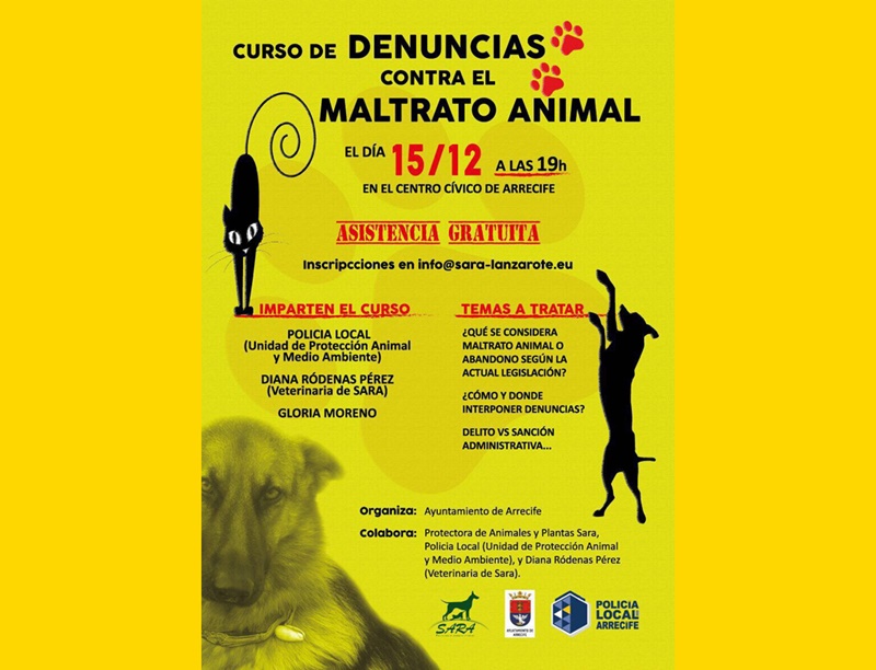 La Unidad de Protección Animal de la Policía Local de Arrecife, cuyo responsable es David Duarte, organiza el próximo 15 de diciembre a las 19.00 horas en el Centro Cívico de la capital un Taller de Denuncias contra el Maltrato Animal.