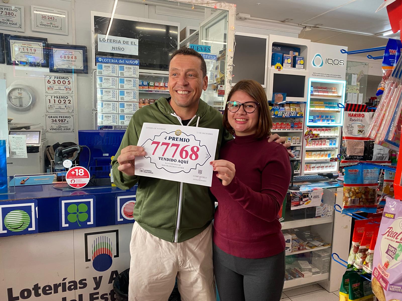 La suerte está sonriendo a Lanzarote en este Sorteo Extraordinario de Navidad, con la caída de un tercer y un cuarto premio en diferentes puntos de la isla. La administración de lotería situada en San Francisco Javier, conocida como "Bazar La Juani", repartió el número 77768, correspondiente al cuarto premio, que desató la alegría entre los afortunados vecinos del barrio.