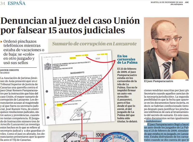 La querella se basa en la documentación recopilada por el abogado y empresario Luis Lleó, imputado en la causa, quien ya denunció estos hechos abriéndose una investigación en el Juzgado de Instrucción número 3 de Arrecife no sólo contra el magistrado y su secretario, sino contra dos guardias civiles, por presunta falsedad de documento público. Como Pamparacuatro es aforado, la querella se ha presentado ahora ante el Tribunal Superior de Justicia de Canarias. En ella se recoge que el 29 de agosto y el 1 y 5 de septiembre juez y secretaio habrían firmado tres autos estando de vacaciones, sin competencia alguna en el Juzgado, habiendo además otros documentos fechados en días en los que estaban de permiso por enfermedad familiar. "Estos presuntos delitos pueden tumbar toda la instrucción del caso Unión", apunta ABC.