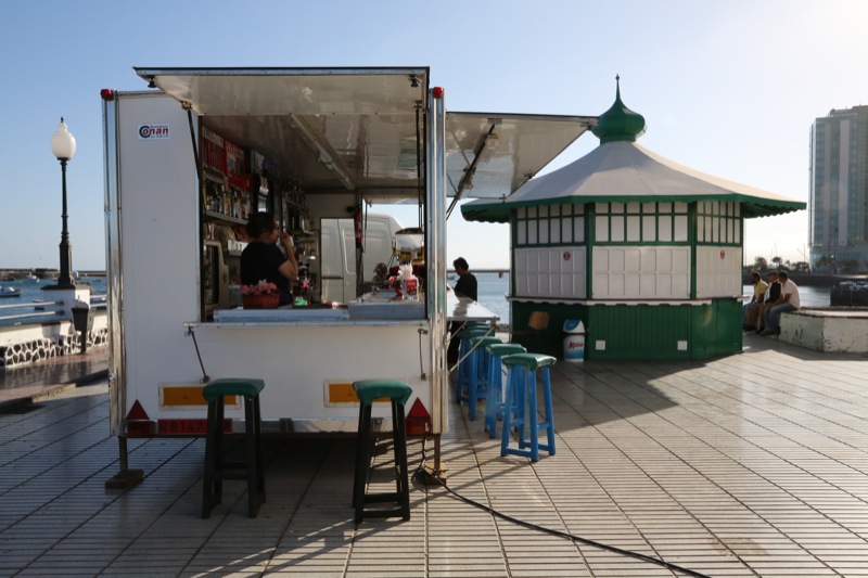 A falta de quiosco, una caravana. Este vehículo, similar a los instalados en el aparcamiento del Parque Temático, es el puesto en el que ahora se pueden comprar bebidas y aperitivos en el muelle de la Pesquería. Será así hasta que se normalice la situación del quiosco ubicado en esta zona y que hace días fue cerrado después de que el Ayuntamiento de Arrecife pidiera la documentación a las personas que lo gestionaban.