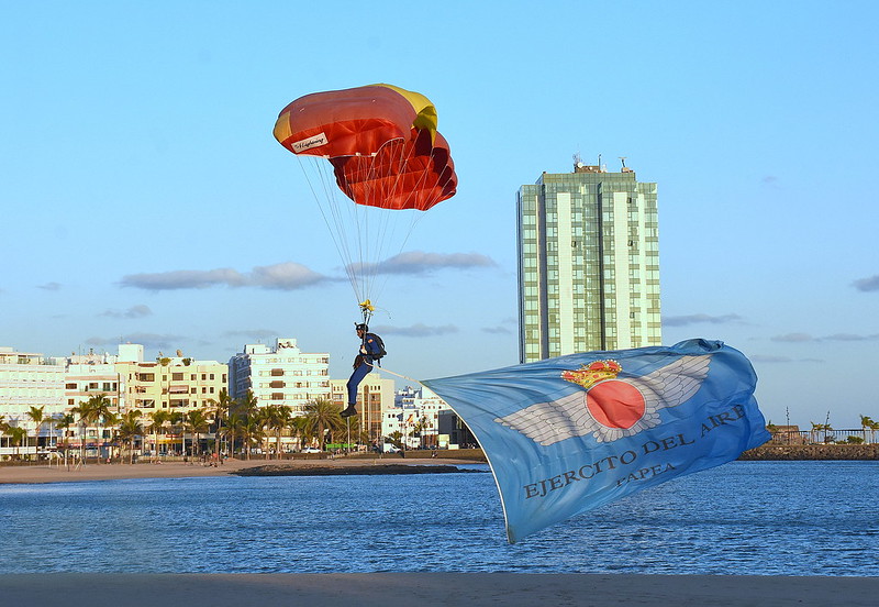 La Patrulla Paracaidista del Ejército del Aire (PAPEA) realizaba este lunes una exhibición con motivo del 50 aniversario del Escuadrón de Vigilancia Aérea en la playa del Reducto.
