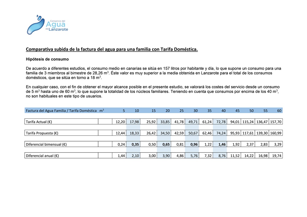 En ese sentido, el Cabildo asegura que con la subida aprobada en el Consorcio a Canal Gestión, una familia de tres miembros y un consumo medio de 18 toneladas, pagará de media tan solo 32 céntimos más de lo que venía haciendo hasta ahora.