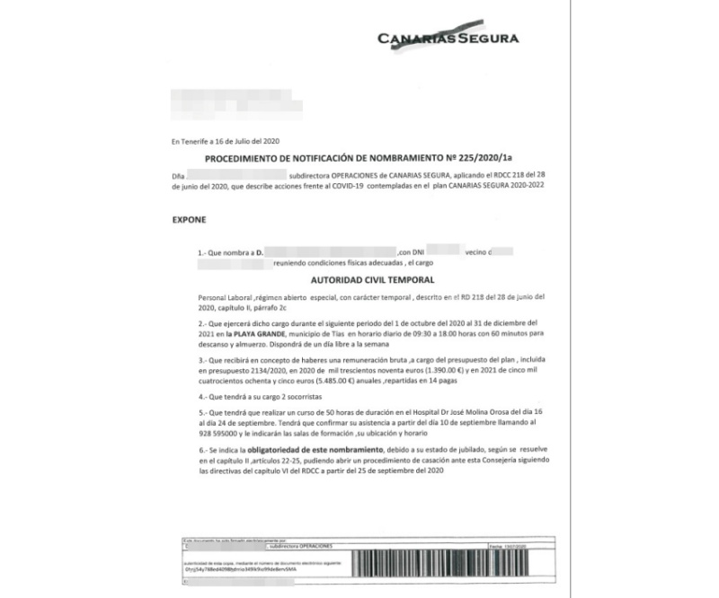 Indica la carta que el nombramiento se realiza en virtud de Real Decreto 218 de 28 de junio de 2020 (este Real Decreto si bien existe no dispone ese nombramiento) con ocasión de la declaración de pandemia por COVID-19 para ejercer dicho cargo con una remuneración y horario pre-establecido, de 14 pagas y 1390 eur/mes en una playa cerca de su lugar de residencia y a cargo de dos trabajadores.