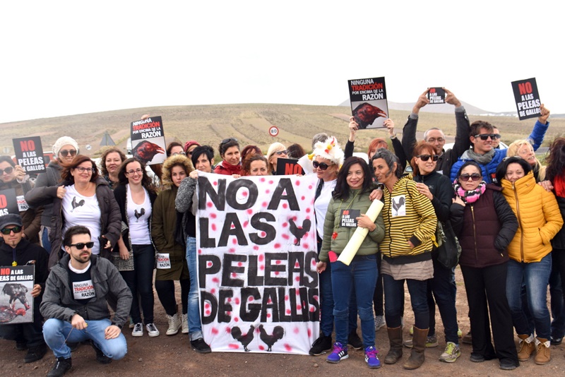Cerca de 30 personas decidieron protestar el pasado sábado contras las peleas de gallos en el Complejo Agroindustrial de Teguise, lugar sonde se están celebrando estos encuentros que enfrentan a dos bandos bien diferenciados: los que velan por los derechos de los animales y un sector, cada vez más minoritario, que pone en escena una antigua tradición en las Islas.